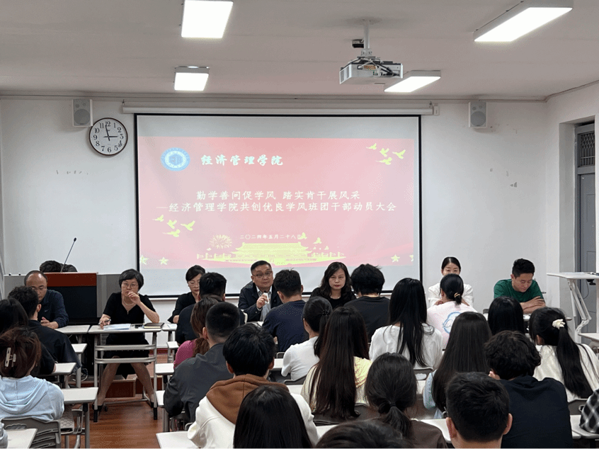 5月29日下午,经济管理学院在H0113教室召开“勤学善问促学风 踏实肯干展风采”共创优良学风班团干部动员大会。院长闫荣国、党总支副书记朱芳芳、副院长张彤璞、全体辅导员、学生会及班团干部70余人参加会议。学工办主任胡欣主持。胡欣通报近期学风督查情况及惩罚举措。副院长张彤璞结合教育教学审核评估,介绍其重要意义、时间安排、评估标准等,号召学生树立“主人翁”意识,以最佳状态迎接审核评估。副书记朱芳芳组织全体学生干部诵读经济管理学院学生行为规范,...
